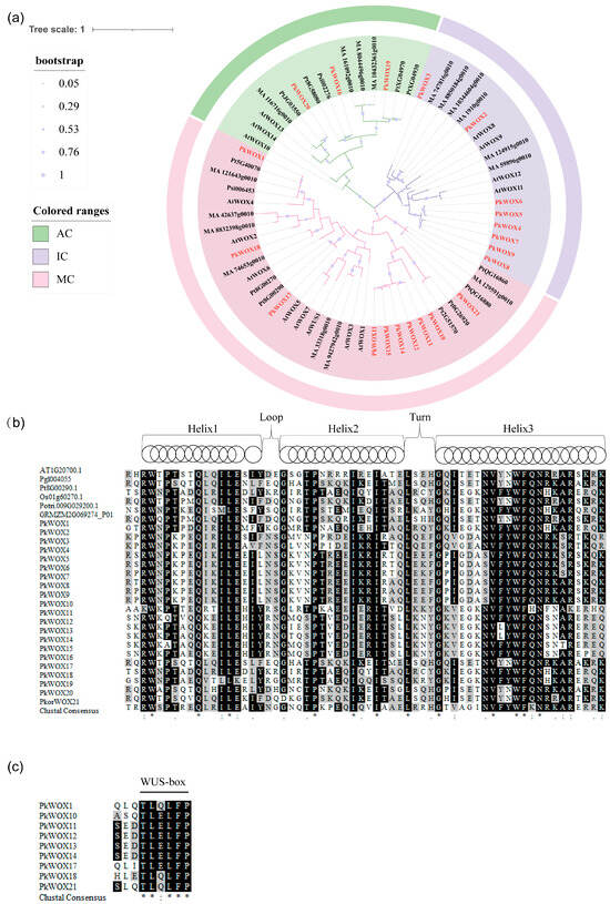 Phylogenetic analysis and multiple alignment of the amino acid sequences of 21 PkWOX proteins. (a) Cross-species phylogenetic analysis of WOX proteins, including A. thalian, Korean pine, Pinus tabuliformis, P. abies, and Picea sitchensis. The phylogenetic tree was constructed using the maximum likelihood method in MEGA, with 1000 bootstrap replicates under the Poisson model. The gene classes are indicated by different colors. The taxon names are shown in pink for the modern clade (MC), in purple for the intermediate clade (IC) and in green for the ancient clade (AC). The members of the WOX protein from Korean pine are shown in red. (b) Amino acid alignment of the conserved domains of WOX proteins from different organisms at, A. thalian; Pk, Korean pine; Pgl, Picea glauca; Pt, P. tabuliformis; Os, O. sativa; Potri, P. trichocarpa; GRMZM, Z. mays. (c) Alignment of the C-terminal region in a subgroup of the WUS family. In (b,c), identical residues are shown in black boxes, conservative changes in gray. Identity between residues is indicated by an asterisk, conservative changes are indicated by double dots, and less-conservative changes are indicated by single dots.