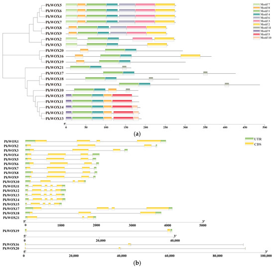 Structural characterization of PkWOX transcription factors in Korean pine. (a) Distribution of conserved protein motifs identified through predictive analysis, with distinct colors representing different motif types. (b) Genomic organization of PkWOX genes, depicting coding exons (yellow), non-coding flanking regions (green), and intronic sequences (black lines).
