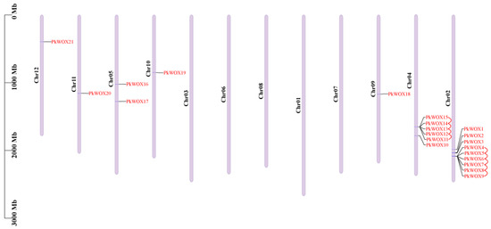 Genomic distribution and segmental duplications of PkWOX genes in Korean pine. Chromosomal positions are marked with scale bars (Mb) and duplicated gene pairs are connected by red lines. Gene labels and chromosome numbers are displayed in red and on the left, respectively.
