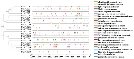 The 2-kb upstream sequences of PkWOX genes were analyzed for cis-regulatory elements using PlantCARE, followed by visualization with TBtools.