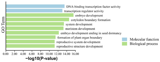 Gene Ontology (GO) enrichment analysis was performed to investigate the biological roles of PkWOX genes (Figure 6). The results demonstrated significant enrichment in biological processes including embryonic development, reproductive system formation, and post-embryonic growth, consistent with the known functions of WOX family members. At the molecular level, PkWOX proteins exhibited DNA-binding transcription factor activity and transcriptional regulation capacity. These findings not only confirm the involvement of PkWOX genes in critical developmental processes but also suggest their potential roles in mediating plant responses to various biotic and abiotic stress factors, highlighting their importance as transcriptional regulators in Korean pine.