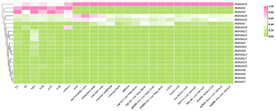 Analysis of PkWOX gene expression across multiple tissue types (Figure 7) revealed distinct spatial patterns among family members. While PkWOX16 demonstrated ubiquitous expression in all examined tissues including embryonic callus, non-embryonic callus, somatic embryos, zygotic embryos, seeds, bark, phloem, cambium, xylem, roots, leaves, and branches, PkWOX2 and PkWOX3 exhibited highly specific expression profiles. These two genes showed elevated transcript levels exclusively in embryogenic tissues (embryonic callus, non-embryonic callus, somatic embryos, and zygotic embryos), with negligible expression detected in vegetative organs. This differential expression pattern suggests specialized functional roles for specific PkWOX members during embryogenesis versus broader regulatory functions for PkWOX16 across various developmental contexts. Statistical analysis was conducted using one-way analysis of variance (ANOVA) with Duncan’s multiple range test in SPSS to compare the expression levels of individual genes among different tissue regions (Table S5).