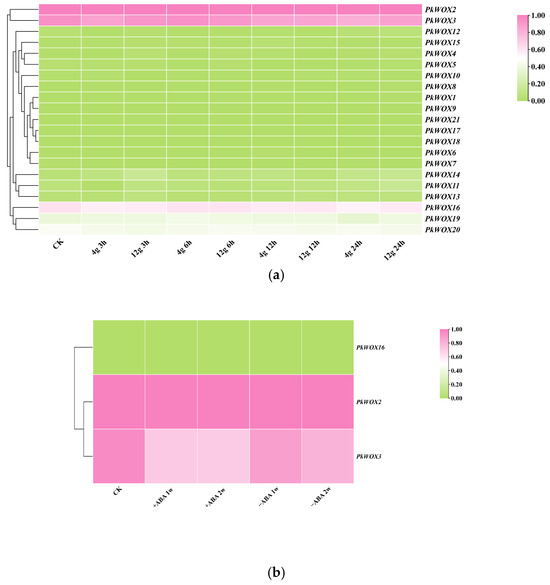 As shown in Figure 8a, the expression patterns of PkWOX members were visualized under different concentrations of gellan gum. PWOX2, 3, and 16 were strongly expressed in all treatments and at all stages. Others were almost not expressed in all treatments and stages. Compared to the control, PkWOX2, 3, and 16 showed no significant fluctuation in expression in all gellan gum treatments. Interestingly, based on the above analysis, we only analyzed the expression levels of three genes, PkWOX2, 3, and 16, under ABA treatment and found that PkWOX2 and 16 were induced and upregulated by ABA; however, PkWOX3 was induced and downregulated by ABA (Figure 8b). Statistical analysis was conducted using SPSS v27, where one-way ANOVA, combined with Duncan’s multiple range test, was applied to examine differential gene expression across different abiotic stress conditions (Tables S6 and S7).