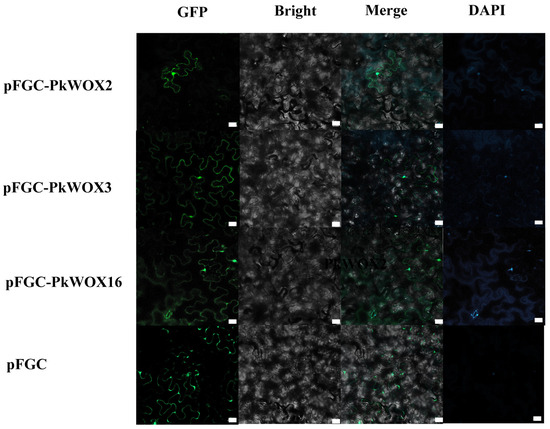 Subcellular localization of the PkWOX proteins. DAPI, a dye used to stain the nucleus; BF: bright field; Merge: Merged images of BF, GFP, and DAPI staining. White square: scale bar. Scale bar = 20 μm.