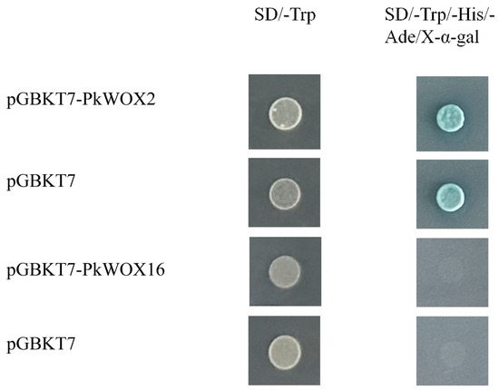 The transcriptional activation capability of PkWOX proteins was evaluated using a yeast-based assay system, with the pGBKT7 empty vector serving as the negative control.