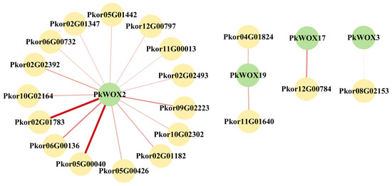 For PkWOX2, 3, 17, and 19 predicted 15, 1, 1, and 2 interacting proteins (Figure 11). A description of the interacting proteins can be found in Table S3. Line width indicates predicted PPI strength.