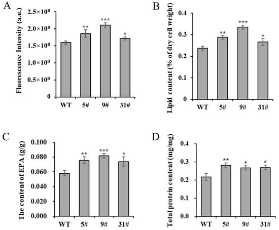 The lipid and protein contents of transgenic P. tricornutum. The 8-day-old P. tricornutum cells (WT, transgenic line 5#, 9#, and 31#) were used to all assays. (A) Neutral lipid content determined by Nile red staining. (B) Total lipid content in dry cell weight determined by gravimetry. (C) EPA content in dry cell weight determined by GC–MS. (D) Total protein content determined by BCA protein assay kit. Each value represents mean ± SD (n = 3). Asterisks in (A–D) represent significant differences (t test, * p < 0.05; ** p < 0.005; *** p < 0.001). The results of significant analyses were compared with WT in the statistical analysis.