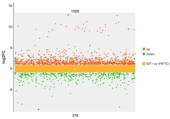 RNA m6A is a dynamic and reversible epigenetic modification that regulates gene expression via various mechanisms such as alternative splicing, mRNA export, mRNA stability, translation, and transcriptional regulation [,]. The expression of FTO in rice and potatoes mediates m6A demethylation, thereby promoting chromatin accessibility and activating transcription []. In this study, transcriptome analysis demonstrated that PtFTO activated the expression of numerous genes in transgenic P. tricornutum, of which 1556 were upregulated (Figure 5). These findings indicate that the mechanism through which PtFTO operates in P. tricornutum is analogous to its function in higher plants.