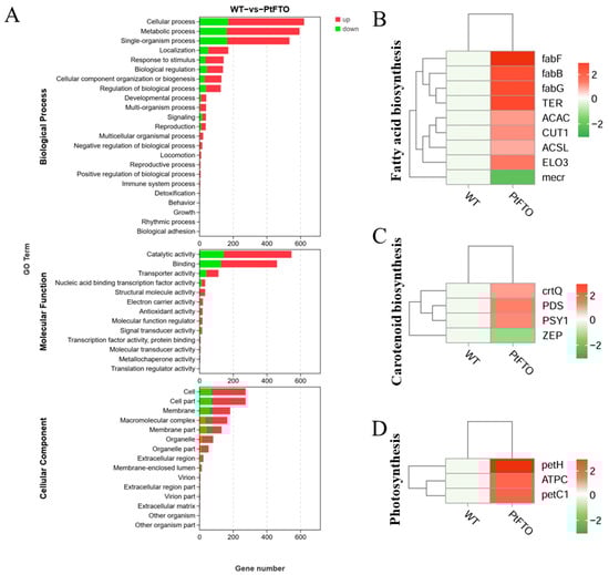 To study the influence of the PtFTO gene on the expression of various genes in transgenic microalgae, transcriptome analysis technology was used to analyze the differences between transgenic P. tricornutum and wild type. Transgenic line 9#, which exhibited the most pronounced phenotypical change, was selected for transcriptome analysis. Based on the screening criteria of p < 0.05 and up-regulation or down-regulation fold changes ≥ ±1.5, we identified 2103 DEGs between transgenic and wild-type P. tricornutum groups, among which 1009 and 378 genes were, respectively, upregulated and downregulated (Figure 5). Based on GO analysis, all DEGs were classified into 51 GO functional terms under the three main ontologies: biological processes, cellular components, and molecular functions. In the majority of GO functional terms, significantly more genes were upregulated than downregulated (Figure 6A). These results demonstrate that the overexpression of PtFTO in P. tricornutum activated the expression of numerous genes, potentially resulting in significant changes in characteristics.