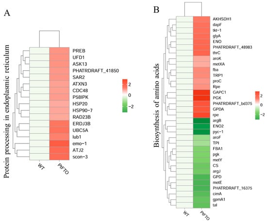 The DEGS involved in amino acid synthesis. KEGG analysis mapped protein processing in endoplasmic reticulum (A) and biosynthesis of amino acids (B). Red bars represent up-regulated genes, and green bars represent down-regulated genes. DEGs were enriched with up-regulation or down-regulation fold changes of ≥±2 and p < 0.05.