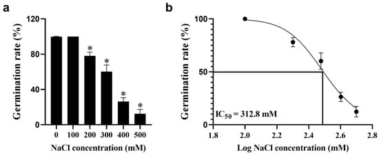Germination test of quinoa seeds under CK and NaCl treatment. Germination rate under CK and varying NaCl concentrations. (a). Significant differences in germination rate among varying NaCl concentrations (b). The half maximal inhibitory concentration of quinoa seed germination under varying NaCl concentrations. Data are presented as mean ± SD, n = 3. * p < 0.05.