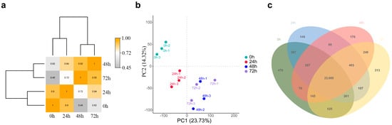 Gene expression analysis between samples. Cluster analysis (a), PCA analysis (b) and Venn analysis (c) between tgroups.