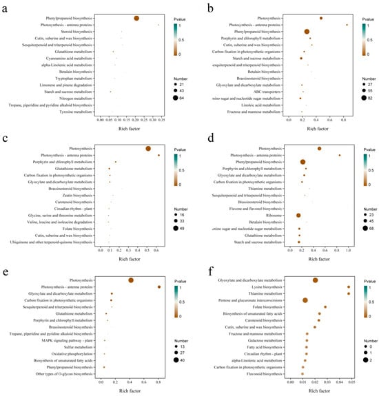 A total of 5486 DEGs with p values < 0.05 and fold change |(FC)| > 2 were screened by comparison between groups (Table 3). There were 1078 DEGs at 24 h under salt stress, which was much less than the number of DEGs at 48 (3145) and 72 h (3112), but only 76 DEGs were consistent between 48 and 72 h, which further indicated that there were differences in the regulatory mechanism of quinoa in the early and late stages of the salt stress response. KEGG enrichment analysis revealed that DEGs at 24 h under salt stress were highly enriched in “phenylpropanoid biosynthesis” (Figure 5a). The 48 h samples were primarily enriched in “photosynthesis”, “phenylpropanoid biosynthesis” and “starch and sucrose metabolism” (Figure 5b), whilst the 72 h samples were primarily enriched in “photosynthesis”, “phenylpropanoid biosynthesis” and “ribosome” (Figure 5d). KEGG enrichment analysis of DEGs at 48 h vs. 24 h, 72 h vs. 24 h and 72 h vs. 48 h indicated that 48 and 72 h vs. 24 h were primarily enriched in “photosynthesis” and “photosynthesis-antenna proteins” (Figure 5c,e). The comparison of 72 h vs. 48 h identified enrichment primarily in “glyoxylate and dicarboxylate metabolism” and “pentose and glucuronate interconversions” (Figure 5f). Thus, there are not only differences in the number of DEGs in the early (24 h) and late (48 and 72 h) stages of salt stress, but also in the regulatory mechanisms involved.