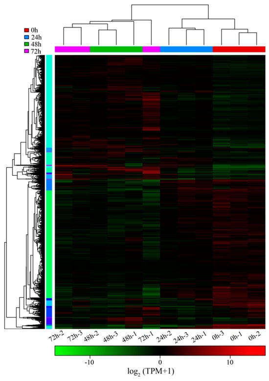 To explore response genes at the seedling stage under salt stress, quinoa seedlings were treated with 300 mM NaCl (~IC50) 1 day after germination as the stress treatment and then sampled at 0, 24, 48 and 72 h for RNA-seq analysis. The 12 RNA-seq samples generated approximately 69~102 hundred million bases, and more than 90% of the input reads could be compared to the quinoa reference genome (Table 1). A threshold of the mean TPM > one of genes in the three replicates was used to identify the expressed genes. We found that the number of expressed genes at 24 h (24,251), 48 h (24,075) and 72 h (24,292) after salt stress was altered compared to that at 0 h (24,350) (Table 2). According to the gene expression level, group clustering found that the 0 and 24 h samples were clustered as adjacent clades, distant from the 48 and 72 h clades, indicating that the expression patterns of many genes changed with increasing stress time (Figure 4a). In addition, the PCA of the different sample transcript profiles could be divided into three groups: 0 h, 24 h, and 48 and 72 h (Figure 4b), which is consistent with the results of cluster analysis. The Venn diagram indicated that 22,689 genes were commonly expressed in all samples, with 478, 149, 176 and 313 genes specifically expressed at 0, 24, 48 and 72 h, respectively (Figure 4c). This result suggests that salt stress represses the expression of a large number of genes, but as the duration of salt stress increases, some genes involved in the regulatory mechanisms of salt stress are activated. It is inferred from the results of PCA and cluster analysis that the early (24 h) involvement of pathways or genes in salt stress regulation may be different from the later stage (48 and 72 h).