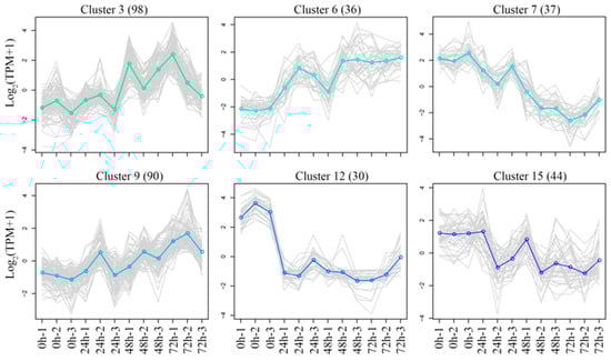 We performed a k-means clustering analysis of the 5165 DEGs using the k-means function in R (Figure 6). A total of 30 clusters with various gene expression dynamics were identified. Significantly, Clusters 3, 6, 7, 9, 12 and 15 exhibited obviously specific expression patterns (Figure 7). The transcription levels of 98, 36 and 90 genes contained in Clusters 3, 6 and 9, respectively, increased with increasing stress time, whereas the transcription levels of 37, 30 and 44 genes contained in Clusters 7, 12 and 15, respectively, decreased with increasing stress time. KEGG analysis of six clusters with significant specific expression patterns revealed that Cluster 3 was significantly enriched in “phenylpropanoid biosynthesis”, “zeatin biosynthesis” and “glutathione metabolism”, Cluster 6 was enriched in “phenylpropanoid biosynthesis”, Cluster 7 was enriched in “photosynthesis-antenna proteins”, Cluster 9 was enriched in “phenylpropanoid biosynthesis” and “cysteine and methionine metabolism”, Cluster 12 was enriched in “phenylpropanoid biosynthesis”, and Cluster 15 was enriched in “phenylpropanoid biosynthesis”, “ubiquitin mediated proteolysis”, “RNA polymerase” and “protein processing in endoplasmic reticulum” (Table 4). These results suggest that quinoa coping strategies for salt stress are multifaceted and complex, and DEG enrichment pathways can provide important clues for the regulatory mechanism of quinoa salt stress.