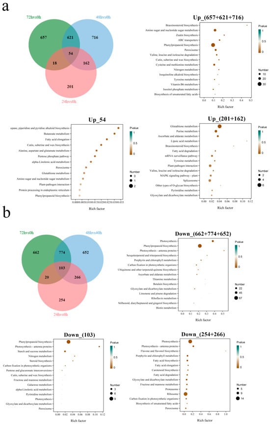 Venn diagram and KEGG enrichment analysis of the up-regulated (a) and down-regulated (b) genes between comparisons of 72 h vs. 0 h, 48 h vs. 0 h and 24 h vs. 0 h.