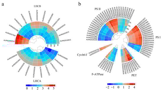 Heatmap of expression patterns of DEGs in photosynthesis (a) and photosynthesis-antenna (b).