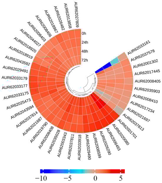 Salt stress has an impact on the entire growth and development process of quinoa; not only will early osmotic stress lead to the loss of quinoa water, but later ionic toxicity will also lead to an imbalance in the ROS [32]. Therefore, to explore genes that are highly correlated with the regulatory mechanisms of salt stress, we compared the DEGs of 72 h vs. 0 h, 48 h vs. 0 h and 24 h vs. 0 h. As shown in Figure 6, there were 1395 DEGs co-expressed in 72 h vs. 0 h and 48 h vs. 0 h, 1319 DEGs specifically expressed in 72 h vs. 0 h and 1368 DEGs specifically expressed in 48 h vs. 0 h. KEGG enrichment revealed that these up-regulated DEGs were enriched in “phenylpropanoid biosynthesis” (Figure 8a) and down-regulated in “phenylpropanoid biosynthesis” and “photosynthesis” (Figure 8b). We speculate that these pathways may be involved in the regulatory mechanisms of quinoa under salt stress in later stages. A total of 157 DEGs were co-expressed in 72 h vs. 0 h, 48 h vs. 0 h and 24 h vs. 0 h. KEGG enrichment indicated that there was no significant enrichment pathway for these up-regulated DEGs (Figure 8a). The down-regulated DEGs were primarily enriched in “phenylpropanoid biosynthesis” and “starch and sucrose metabolism” (Figure 8b). However, 455 DEGs were specifically expressed in 24 h vs. 0 h, and 428 DEGs were co-expressed in 48 h vs. 0 h and 24 h vs. 0 h. KEGG enrichment indicated that these up-regulated DEGs were enriched in “glutathione metabolism” (Figure 8a) and down-regulated in “photosynthesis” and “ribosome” (Figure 8b). We speculate that these pathways may be involved in the regulatory mechanisms of quinoa under salt stress in the early stage. Since the co-expressed DEGs of 72 h vs. 0 h and 24 h vs. 0 h are unlikely to participate in salt stress regulation, no further analysis was performed.
