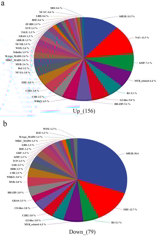 Due to the key role of transcription factors in the regulation of salt stress process sections, we predicted that TFs for 2411 and 2711 were up- and down-regulated DEGs, respectively. A total of 156 up-regulated TFs belonging to 31 TF families were screened and found to be dominated by bHLH, NAC and bZIP. Seventy-nine down-regulated TFs, belonging to twenty-three TF families, were dominated by bHLH, ERF and B3 (Figure 12). bHLH, ERF, B3, MYB_related, G2-like, C2H2, GRAS, HD-ZIP, MYB, WRKY, C3H, TCP, bZIP, GRF, HSF, LBD, MIKC_MADS, M-type_MADS and WOX were shared between up- and down-regulated genes. Notably, we found that 45 TFs belonging to NAC, NF-YA, Dof, Trihelix, NF-YB, ARR-B, GATA, TALE, ZF-HD, BES1, NF-YC and SRS were specifically up-regulated by salt stress. Meanwhile, eight TFs belonging to CO-like, DBB, LSD and RAV were specifically down-regulated by salt stress (Tables S5 and S6). Therefore, we hypothesize that these TFs may be important positive and negative transcriptional regulators in response to salt stress signaling in quinoa seedlings.