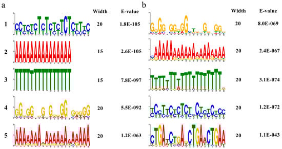 The transcriptional regulation of TFs underlying many biological processes is initiated by recognizing external signals, and deciphering the potential cis-elements of TFs affected by salt stress can help to rapidly identify upstream signals. To determine which cis-element is enriched in the TF promoters up- and down-regulated by salt stress, we submitted the 2.0 kb sequences of these gene promoter regions to PlantCARE and found that “defense and stress-responsive”, “MeJA-responsive”, “drought-inducibility”, “abscisic acid-responsive”, “auxin-responsive”, “salicylic acid-responsive”, “gibberellin-responsive” and other cis-elements were present in the 156 and 79 TF promoters that were up- and down-regulated (Figures S3 and S4). The 235 predicted TFs not only respond to abiotic stress regulation, but also participate in a variety of biogenic hormone metabolic pathways. Motif analysis of the promoter regions of TFs by MEME yielded five extremely significant DNA motifs for the up- and down-regulated TF promoter regions (Figure 13). With a cutoff of e-value = 0.1, we matched the overrepresented motifs to known cis-elements in Arabidopsis. Among the five motifs up-regulated by salt stress, motifs 1 and 5 were better matched with the BPC5 binding site of the BBRBPC TFs, motifs 2 and 3 were better matched with the VRN1 binding site of the ABI3/VP1 TFs, and motif 4 was better matched with the MYB67 binding site of the MYB TFs. VRNs are key regulators of the abscisic acid (ABA) signaling pathway, whereas MYBs are involved in the salicylic acid (SA) signaling pathway, both of which play an important role in plant responses to stresses. Among the five motifs down-regulated by salt stress, motifs 1 and 2 were better matched with the MYB60 binding site of the MYB TFs, and motifs 3, 4 and 5 were better matched with the DEL2 binding site of the E2FDP TFs, the TCP1 binding site of the TCP TFs and the WLIM2A binding site of the LIM TFs (Table 5).