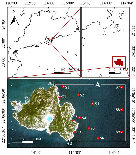 MATLAB 2019 b was used to process satellite remote sensing data, which included resampling to unify data resolution, removing invalid values, and calculating yearly averages. ENVI software 5.6.2 was used to derive the length of coastline, specifically for the land area between points A1 and A2 within the boxed region A in Figure 1. The FVCOM tidal model was used to compute the tidal elevation at the time of satellite overpass. These elevation data were subsequently input into a tidal level calculation formula [27] to extract the intertidal zone. Finally, the coastline length, island area, and beach area were calculated using ArcGIS 10.3 software (Esri, Redlands, CA, USA).