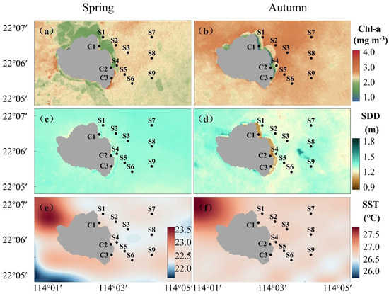 Spatial and temporal distribution of environmental factors in the Wailingding marine ranching: (a) Chl−a in spring, (b) Chl−a in autumn, (c) SDD in spring, (d) SDD in autumn, (e) SST in spring, (f) SST in autumn.