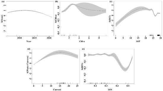 In GAMs, the contribution of the selected factors to the MECC of marine ranching indicates a degree of influence (Table 3). The most influential factor was Year, with a contribution of 66.20%, followed by Chl-a, with a contribution of 20.60%. The factors with lesser influence on the model were SST, Water Current, and DIN, with contributions of 4.40%, 3.60%, and 0.60%, respectively. The F-test showed that Year, Chl-a, SST, DIN, and Water Current were significantly correlated with the MECC (p < 0.05). The chi-square test showed that the non-parametric smoothing effects of the selected explanatory variables were good.
