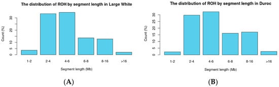 After combining the genotyping data of Large White and Duroc pigs and applying filters, a total of 25,105 variants were retained. Scanning for runs of homozygosity (ROH) revealed 14,862 segments in Large White (LW) pigs, averaging 26 segments per animal, and 25,660 segments in Duroc pigs, averaging 42 segments per animal. Summary statistics for the segments are provided in the Supplementary File S2 (Tables S1 and S2). The distribution of segments by length (<2 Mb, 2–4 Mb, 4–6 Mb, 6–8 Mb, 8–16 Mb, and >16 Mb) is presented in Figure 1.