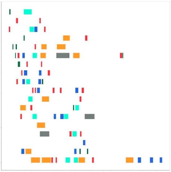Following the identification and length-based classification of the ROH segments, ROH maps were created for each animal. Figure 2 shows the ROH map for a representative animal. Each row in the figure corresponds to a chromosome, arranged from top to bottom, from chromosome 1 to 18. Chromosome numbers are not displayed in the figure to avoid noise during image recognition. The ROH segments are classified by length in Mb and are represented by different colors: segments less than 2 Mb are green, 2–4 Mb are red, 4–6 Mb are blue, 6–8 Mb are turquoise, 8–16 Mb are orange-yellow, and segments longer than 16 Mb are gray.