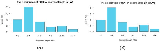 The distribution of ROH by segment length ((A) The distribution of ROH by segment length in LW1; (B) The distribution of ROH by segment length in LW2).