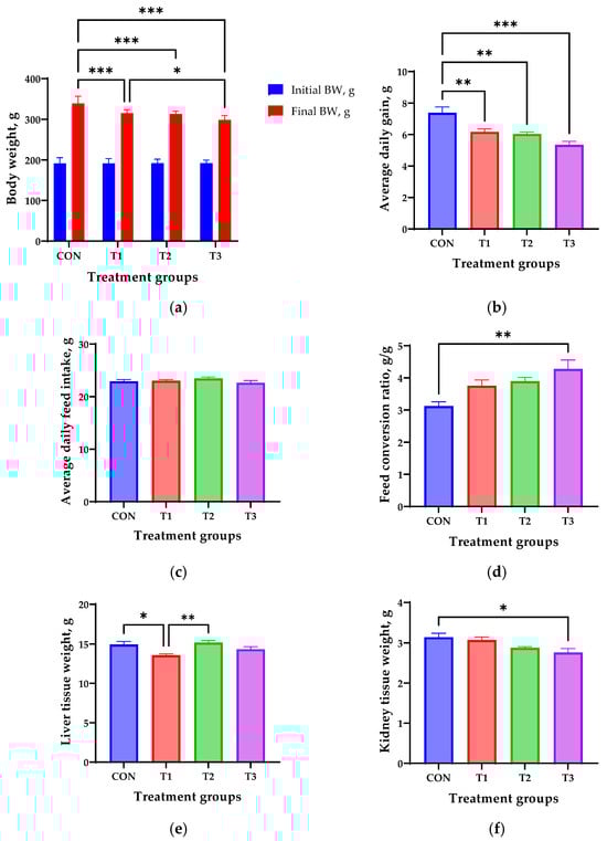Growth performance and tissue weight in 7-week-old rats orally administered different doses of deoxynivalenol (DON) for 42 days. (a) Initial and final body weight (BW). (b) Average daily gain. (c) Average daily feed intake. (d) Feed conversion ratio. (e) Liver tissue weight. (f) Kidney tissue weight. Treatment groups: CON: control group, 0.9% saline by gavage; T1: 0.5 mg/L DON with 0.9% saline by gavage; T2: 50 mg/L DON with 0.9% saline by gavage; T3: 100 mg/L DON with 0.9% saline by gavage. * p < 0.05, ** p < 0.01, *** p < 0.001.
