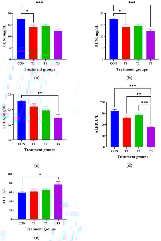 Blood biochemistry, including (a) amylase (AMYL), (b) blood urea nitrogen (BUN), (c) creatinine (CREA), (d) alkaline phosphatase (ALKP), and (e) alanine aminotransferase (ALT), in 7-week-old rats orally administered deoxynivalenol (DON) for 42 days. After 42 days of oral DON gavage, blood samples were collected from each rat via cardiac puncture. Treatment groups: CON: control group, 0.9% saline by gavage; T1: 0.5 mg/L DON with 0.9% saline by gavage; T2: 50 mg/L DON with 0.9% saline by gavage; T3: 100 mg/L DON with 0.9% saline by gavage. * p < 0.05, ** p < 0.01, *** p < 0.001.