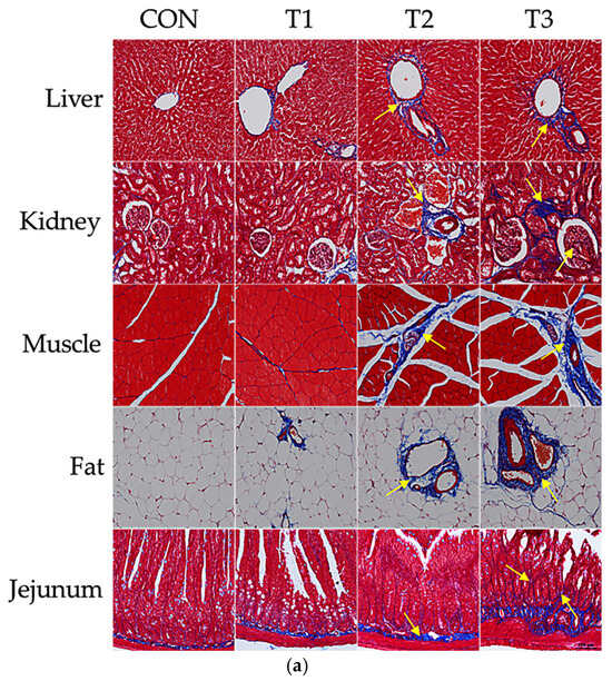 Masson’s trichrome staining was performed to examine histopathological changes in the liver, kidney, muscle, jejunum, and adipose tissue (Figure 3a). The control group retained a relatively normal hepatic lobular structure. In contrast, in the T1 group, slight collagen deposition was observed around the portal vein compared with that in the control group, indicating the onset of mild fibrosis. In the T2 group, collagen deposition around the portal vein increased significantly and fibrous septa were formed, which became more severe in the T3 group. In the kidney, no evidence of fibrosis was noted in the control group, whereas in the T1 group, collagen deposition around the glomeruli was observed, which became more pronounced in the T2 group and extended into the tubular regions. In the T3 group, the degree of fibrosis was further increased. In the muscle tissue, the control group exhibited uniformly arranged and closely spaced muscle fibers. The muscle fibers in the T1 group appeared similar to those in the control group, although some areas showed increased collagen deposition. In both the T1 and T2 groups, there was minimal collagen deposition between the muscle fibers, indicative of an early stage of fibrosis compared with that in the control group. In contrast, in the T2 and T3 groups, spacing between the muscle fibers increased and collagen deposition around and between the fibers increased significantly, indicating advanced fibrosis. In the adipose tissue, the control group showed uniformly sized adipocytes with no signs of fibrosis, whereas the T1 group exhibited small amounts of collagen deposition around certain blood vessels. In the T2 group, the fibrous tissue surrounding the blood vessels became thicker and the overall collagen deposition within the adipose tissue increased. In the T3 group, collagen deposition around several blood vessels or structures increased significantly, indicating a more pronounced change in the adipose tissue structure. The control, T1, and T2 groups showed only a slight increase in collagen deposition in the submucosal area of the jejunum, with no major changes in the overall tissue structure. However, in the T3 group, blue-stained collagen deposition in the submucosal area was more pronounced, the overall barrier was thicker, and the villus shape was significantly deformed compared to the normal shape.
