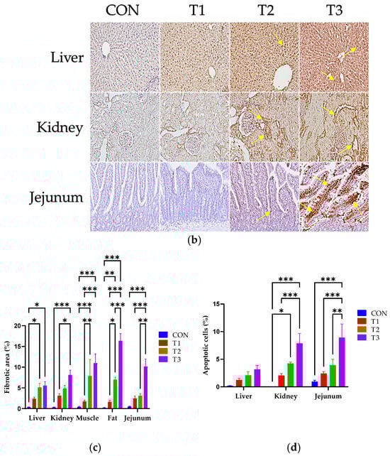 Histological changes in different tissues of 7-week-old rats orally administered different doses of deoxynivalenol (DON) for 42 days. (a) Histological images of the liver, kidney, muscle, jejunum, and adipose tissue sections subjected to Masson’s trichrome staining to detect fibrosis. (b) Apoptosis assessed using terminal deoxynucleotidyl transferase dUTP nick-end labeling (TUNEL) staining. Quantification of collagen (c) and apoptotic cell (d) staining was performed using the ImageJ software. The data are presented as the mean ± SEM. Statistical significance was considered for DON-treated groups compared with the control group by one-way ANOVA followed by Tukey’s post hoc test. Treatment groups: CON: control group, 0.9% saline by gavage; T1: 0.5 mg/L DON with 0.9% saline by gavage; T2: 50 mg/L DON with 0.9% saline by gavage; T3: 100 mg/L DON with 0.9% saline by gavage. The yellow arrows indicate positive signals. * p < 0.05, ** p < 0.01, *** p < 0.001.