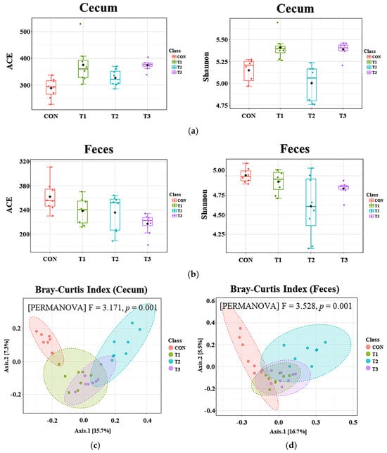 Analysis of alpha and beta diversity in 7−week-old rats orally administered different doses of deoxynivalenol (DON) for 42 days. Alpha diversity in the (a) cecum and (b) feces was assessed using the abundance-based coverage estimator (ACE) and Shannon indices. In the cecum, both the ACE and Shannon indices were increased in the DON treatment groups (p < 0.001). Conversely, in the feces, both indices were decreased in the DON treatment groups (p < 0.001). Beta diversity in the (c) cecum and (d) feces was analyzed using the Bray–Curtis index, revealing distinct shifts in microbiome composition. Significant differences (p = 0.001) were found among the dietary treatment groups in both cecal and fecal samples. Treatment groups: CON: control group, 0.9% saline by gavage; T1: 0.5 mg/L DON with 0.9% saline by gavage; T2: 50 mg/L DON with 0.9% saline by gavage; T3: 100 mg/L DON with 0.9% saline by gavage.