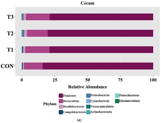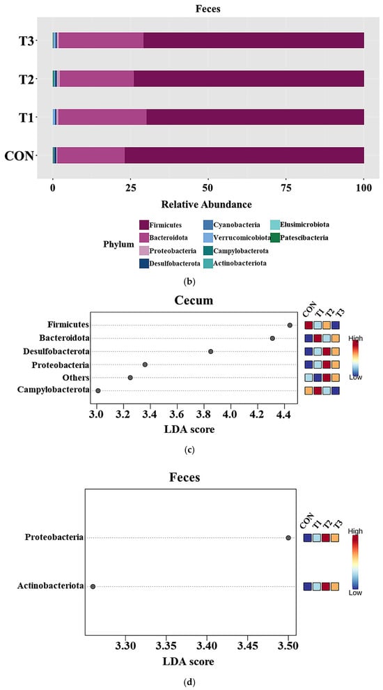 Figure 5 presents taxonomic bar plots illustrating the mean relative abundance of phylum levels in the cecum (Figure 5a) and feces (Figure 5b) across the treatment groups. Across the treatment groups, Firmicutes was the predominant phylum in both the cecum (81.27%) and feces (73.6%), with Bacteroidota following as the second most abundant (cecum: 16.14%; feces: 24.7%). To determine the distinct taxa among dietary treatment groups, LEfSe analysis was conducted at the phylum level (Figure 5c,d). In the cecum, the LEfSe analysis showed that Firmicutes (control group: 84.78%; T1: 79.66%; T2: 81.02%; T3: 79.27%) was relatively abundant in the control group, whereas Bacteroidota (control group: 13.73%; T1: 17.86%; T2: 15.33%; T3: 17.62%) was relatively rare. In the T2 and T3 groups, Desulfobacterota levels were higher (T2: 2.13%, T3: 1.87%) than in the control (0.73%) and T1 (1.35%) groups. Similarly, Proteobacteria levels were higher in T2 (0.55%) and T3 (0.40%) than in the other groups. In contrast, Campylobacterota levels were higher in the control (0.38%) and T1 (0.45%) groups than in T2 (0.26%) and T3 (0.24%). Fecal sample analysis revealed that the T2 group had the highest Proteobacterota levels, at 0.84%, while the other groups had lower levels. Additionally, Actinobacteriota were almost absent in the control group (0.00%), but increased to 0.02% in T1, 0.37% in T2, and 0.07% in T3.