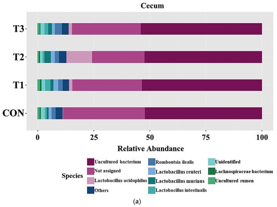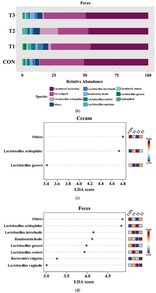 Figure 6 presents taxonomic bar plots illustrating the mean species-level relative abundance in the cecum (Figure 6a) and feces (Figure 6b) across the treatment groups. In the cecum, Lactobacillus acidophilus (3.49%) was the most abundant species, followed by Romboutsia ilealis (2.05%), Lactobacillus reuteri (1.70%), Lactobacillus murinus (1.58%), and Lactobacillus intestinalis (1.58%). In the feces, Lactobacillus acidophilus (4.45%) was the most abundant species, followed by Lactobacillus intestinalis (2.41%), Romboutsia ilealis (2.39%), Lactobacillus reuteri (2.09%), and Lactobacillus murinus (2.09%). LEfSe was used to identify differentially abundant taxa at the species level (Figure 6c,d). In the cecum, the LEfSe analysis showed that Lactobacillus acidophilus (control group: 0.02%; T1: 1.33%; T2: 10.76%; T3: 1.19%) was least abundant in the control group. Lactobacillus gasseri (control group: 0.57%; T1: 0.67%; T2: 0.15%; T3: 0.57%) was least abundant in the T2 group. In the feces, Bacreroides vulgatus (control group: 0.34%; T1: 0.70%; T2: 0.62%; T3: 0.71%) and Lactobacillus acidophilus (control group: 0.09%; T1: 2.26%; T2: 13.74%; T3: 1.13%) were least abundant in the control group. Lactobacillus gasseri (control group: 0.81%; T1: 2.11%; T2: 0.21%; T3: 0.58%), Lactobacillus intestinalis (control group: 1.81%; T1: 4.18%; T2: 1.34%; T3: 2.05%), and Lactobacillus reuteri (control group: 1.58%; T1: 3.17%; T2: 2.00%; T3: 1.47%) were among the most abundant species in the T1 group. Romboutsia ilealis (control group: 2.33%; T1: 1.83%; T2: 1.18%; T3: 3.82%) had the highest abundance in the T3 group.