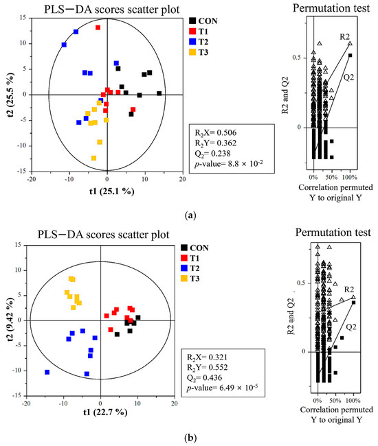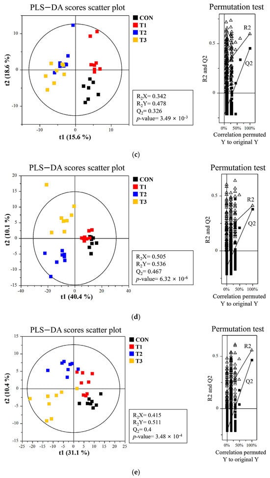Metabolite profiling of rats subjected to different doses of deoxynivalenol (DON). Partial least discriminant analysis (PLS−DA) scatter plots and permutation plots for the (a) blood, (b) liver, (c) kidney, (d) cecum, (e) feces, and (f) metabolic pathways in different DON treatment groups. A 95% confidence interval was used to define deviations in the score plots. Clear clustering (p < 0.001) was observed for DON-treated groups compared with the control group. Treatment groups: CON: control group, 0.9% saline by gavage; T1: 0.5 mg/L DON with 0.9% saline by gavage; T2: 50 mg/L DON with 0.9% saline by gavage; T3: 100 mg/L DON with 0.9% saline by gavage.
