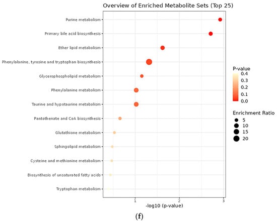 We used LC-MS to profile metabolites in rat blood, liver, kidney, cecum, and feces under different DON toxicity levels. PLS-DA revealed a clear metabolic separation between DON-treated and control groups (Figure 7a–e). Metabolite enrichment was analyzed by determining significant differences in compounds between the control and DON treatment groups (variable importance projection (VIP) > 1.0, p < 0.05). Except for metabolites with an uncertain Kyoto Encyclopedia of Genes and Genomes (KEGG) structure, the DON-treated groups were mainly enriched in terms of metabolism of purine, followed by changes in the biosynthesis of the primary bile acid, ether lipid metabolism, and phenylalanine, tyrosine, and tryptophan biosynthesis (Figure 7f; false discovery rate (FDR) < 1, p < 0.05).