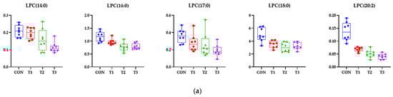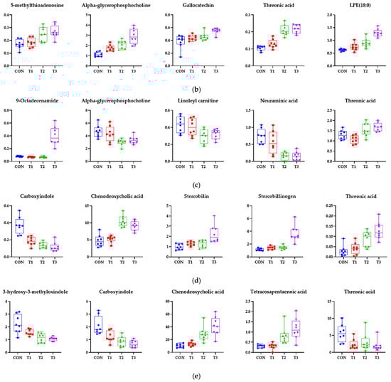 Representative bar graphs of important variables of metabolite projection in the blood and four different tissues: (a) blood, (b) liver, (c) kidney, (d) cecum, and (e) feces. The metabolites in the different samples were significantly different, as determined using an ANOVA model based on Tukey’s test for comparison of means. Treatment groups: CON: control group, 0.9% saline by gavage; T1: 0.5 mg/L deoxynivalenol (DON) with 0.9% saline by gavage; T2: 50 mg/L DON with 0.9% saline by gavage; T3: 100 mg/L DON with 0.9% saline by gavage.