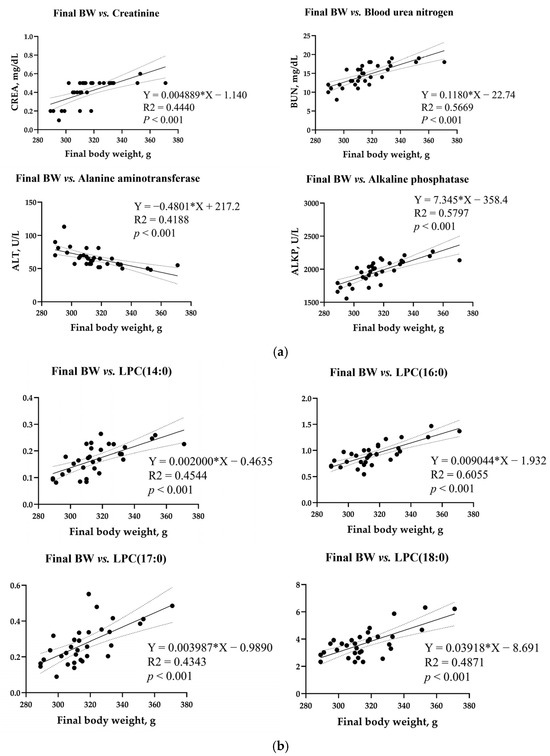 Simple linear regression analysis was performed for the final rat body weight, blood biochemical parameters, metabolites, and microbiota with VIP > 1 and p < 0.05 (Figure 9). A simple linear regression was shown with R2 > 0.3. Among the biochemical parameters, CREA (R2 = 0.4440, p < 0.001), BUN (R2 = 0.5669, p < 0.001), and ALKP (R2 = 0.5797, p < 0.001) showed a positive correlation with final body weight, whereas the ALT activity in the blood (R2 = 0.4188, p < 0.001) showed a negative correlation with final body weight (Figure 9a). Among the metabolites, blood LPC(14:0) (R2 = 0.4542, p < 0.001), LPC(16:0) (R2 = 0.6055, p < 0.001), LPC(17:0) (R2 = 0.4343, p < 0.001), and LPC(18:0) (R2 = 0.4871, p < 0.001) showed a positive correlation (Figure 9b). In the liver, 5-methylthioadenosine (R2 = 0.3948, p < 0.001), alpha-glycerophosphocholine (R2 = 0.3593, p < 0.001), gallocatechin (R2 = 0.3876, p < 0.001), and threonic acid (R2 = 0.3952, p < 0.001) were negatively correlated with final body weight (Figure 9c). In the kidney, neuraminic acid (R2 = 0.4487, p < 0.001) and alpha-glycerophosphocholine (R2 = 0.5864, p < 0.001) levels increased with body weight. On the contrary, the level of linoleyl carnitine (R2 = 0.4949, p < 0.001) was inversely proportional to the body weight (Figure 9d). The cecum metabolite carboxyindole (R2 = 0.5473, p < 0.001) showed a positive correlation, but chenodeoxycholic acid (R2 = 0.4487, p < 0.001) exhibited a negative correlation (Figure 9e). In the feces, 3-hydroxy-3-methyloxindole (R2 = 0.5019, p < 0.001), carboxyindole (R2 = 0.5355, p < 0.001), and threonic acid (R2 = 0.5019, p < 0.001) levels increased with body weight, whereas the levels of chenodeoxycholic acid (R2 = 0.4441, p < 0.001) correlated inversely with body weight (Figure 9f). No correlation was found between the final body weight and the total microbial community, with the R2 value being 0.3 or higher.