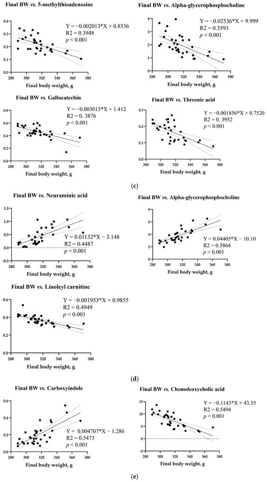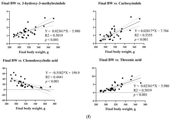 Simple linear regression analysis of the correlation of final body weight with biochemical parameters and metabolite compounds in all the treatment groups. Correlations of final body weight with (a) blood parameters and metabolites in the (b) blood, (c) liver, (d) kidney, (e) cecum, and (f) feces. Correlation coefficients and p-values were calculated using GraphPad Prism (ver. 9.5.1). Linear analysis conditions: variable importance projection (VIP) > 1, p < 0.05, R2 > 0.3.