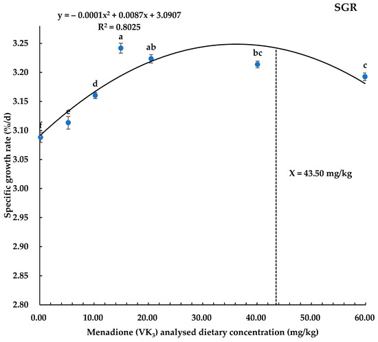 | SGR (%/d) | 3.09 f ± 0.01 | 3.11 e± 0.01 | 3.16 d ± 0.01 | 3.24 a ± 0.01 | 3.22 ab ± 0.01 | 3.21 bc ± 0.01 | 3.19 c ± 0.01 | <0.001 |
