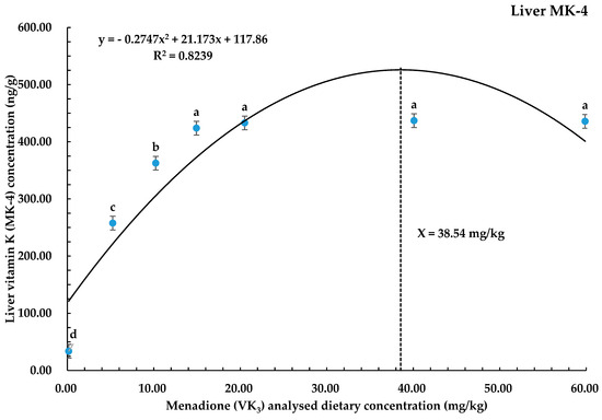| Dietary Vitamin K3 Levels (mg/kg) | Whole-Body MK-4 Concentration (ng/g) | Liver MK-4 Concentration (ng/g) |