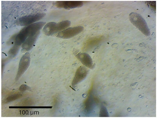 After completing the experiment, we removed the intestines of T. molitor. The midgut (from the stomach to the Malpighian tubules) was placed on a clean microscope slide in a drop of physiological saline (0.9% NaCl solution) to prevent drying and to facilitate the observation of gregarines. Using a scalpel, we opened the intestine by making 12 transverse incisions. Within three minutes of dissection, we analyzed the larval midgut by systematically scanning the slide using stage movement under a microscope [,]. We excluded immature gregarines (gamonts attached to the gut wall via the epimerite) from the count. According to established classifications, once the epimerite is reduced, the gregarine transitions into a freely motile trophozoite stage within the host’s gut []. Only trophozoites released from the midgut during standardized compression with a coverslip were counted. We acknowledge that a small proportion of trophozoites may remain inside the gut; however, we ensured consistency across all samples by applying the same dissection protocol, including standardized incisions, equal volumes of 0.9% NaCl solution, and uniform pressure applied via coverslip. This allowed us to maintain comparability across experimental treatments. We found and identified Gregarina steini (Figure 1) based on its morphological characteristics []. We refined the identification of G. steini using the publications of Clopton & Janovy [,], and Desportes & Schrével [].