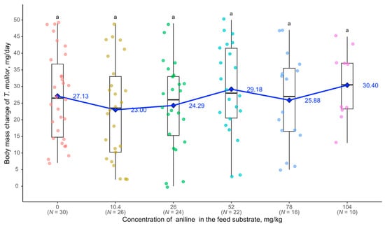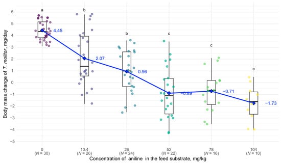 Correlation between T. molitor body weight and aniline concentration: black horizontal line—median, blue diamond—mean, lower and upper boundaries of the rectangle—I and III quartiles, the black vertical line above the box represents the range from the third quartile to the maximum value, and the black vertical line below the box represents the range from the first quartile to the minimum value, the dots represent individual T. molitor specimens, different letters above the boxes indicate statistically significant differences (p < 0.05) between populations according to Tukey’s HSD test, the numbers next to the blue line indicate the mean value.