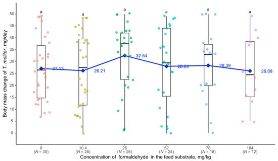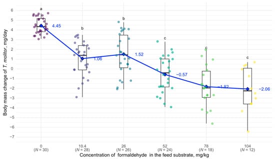At a concentration of 10.4 mg/kg of formaldehyde in the feed substrate, body mass changes began to differ significantly from the control group: in the control, T. molitor larvae gained an average of 4.45 mg per day, whereas, at 10.4 mg/kg, they gained only 1.06 mg per day. At 52 mg/kg, the larvae began to lose body mass during the experiment (an average of −0.57 mg per day). At 104 mg/kg, T. molitor showed an average body mass loss of 2.06 mg per day and 60% mortality (Figure 4).