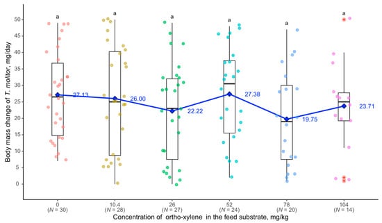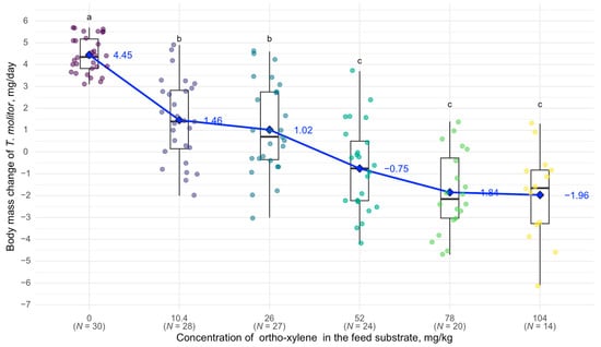 At a concentration of 10.4 mg/kg of o-xylene in the feed substrate, body mass changes began to differ significantly from the control group: in the control, T. molitor larvae gained 4.45 mg per day, whereas, at 10.4 mg/kg, they gained only 1.46 mg per day. At 52 mg/kg, the larvae began to lose body mass during the experiment (an average of −0.75 mg per day). At 104 mg/kg, T. molitor showed an average body mass loss of 1.96 mg per day and 53.5% mortality (Figure 6).