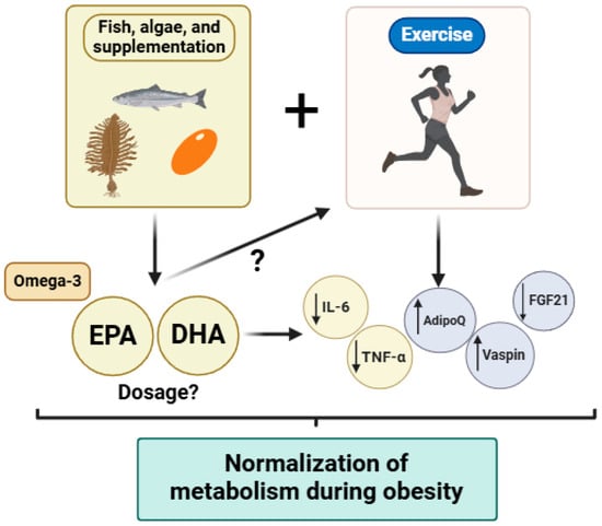 Chicago/Turabian StyleSandoval, Viviana, Álvaro Vergara-Nieto, Amanda Bentes, Saulo Silva, Carolina Núñez, and Sergio Martínez-Huenchullán. 2025. "Omega-3 Fatty Acids and Exercise in Obesity Management: Independent and Synergistic Benefits in Metabolism and Knowledge Gaps" Biology 14, no. 5: 463. https://doi.org/10.3390/biology14050463