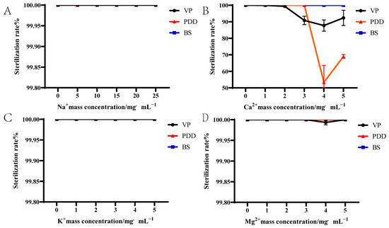 We further treated the aquatic pathogens VP, PDD, and BS with the MBC of PHMB in the presence of additional Mg2+, Na+, and K+ ions (Figure 1). The latter provided no additional bactericidal benefits to PHMB; all three bacteria remained unchanged and bactericidal levels for all three bacteria exceeded 99% after 2 h of incubation. These data indicated that Na+, K+, and Mg2+ did not affect bactericidal activity. In contrast, the bactericidal activity of PHMB against VP and PDD were significantly reduced upon adding 2–5 mg/mL Ca2+ at the corresponding MBC. At a Ca2+ concentration of 4 mg/mL, the bactericidal levels against VP decreased to 87.73% and against PDD to 53.35%. However, Ca2+ did not affect the bactericidal activity of PHMB against BS (Figure 1). These results indicated no significant difference in the effect of Na+, K+, and Mg2+ on PHMB bactericidal activity against VP, PDD, and BS (p > 0.05). However, the bactericidal effect of PHMB on VP and PDD decreased with Ca2+ concentrations > 2 mg/mL and the response varied by strain.